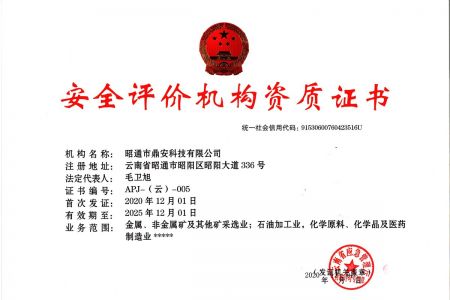 2003年11月10日,昭通市鼎安科技有限公司成立,初始主要從事第三方安全工程技術服務,經(jīng)多年運營,發(fā)展為多專業(yè)綜合科技平臺,為社會提供多種專業(yè)技術服務工作。 現(xiàn)公司注冊資金為1200萬元,公司法定代表人:毛衛(wèi)旭。公司主要業(yè)務:安全評價、安全標準化評審、安全工程技術服務;環(huán)境監(jiān)測、職業(yè)衛(wèi)生檢測、檢驗;法律訴訟及非訴訟服務;司法鑒定、固定資產(chǎn)投資項目節(jié)能服務;工程咨詢;工程測量測繪;安全教育培訓等。是安全生產(chǎn)服務、安全教育培訓機構(gòu),也是環(huán)境監(jiān)測和職業(yè)衛(wèi)生服務機構(gòu),同時也是綜合的檢測檢驗、綜合科技平臺服務機構(gòu)。多年來為公、檢、法、司、軍、警、海關、仲裁、安監(jiān)、工礦商貿(mào)企業(yè)、社會團體及個人提供多專業(yè)技術服務。